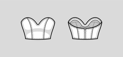 Knee Length Corset Bodice Dress With Strapless Neckline Panel Lines And Cups Seam At Waist Back Zip Closure Flared Skirt With Pleats Back And Front Technical Flat Sketch Vector Illustration Back Wall